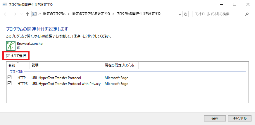 2. Windows 8の場合、「プログラムの関連付けを設定する」画面が表示されます。「すべて選択」のチェックボックスをチェックし、保存ボタンをクリックします。