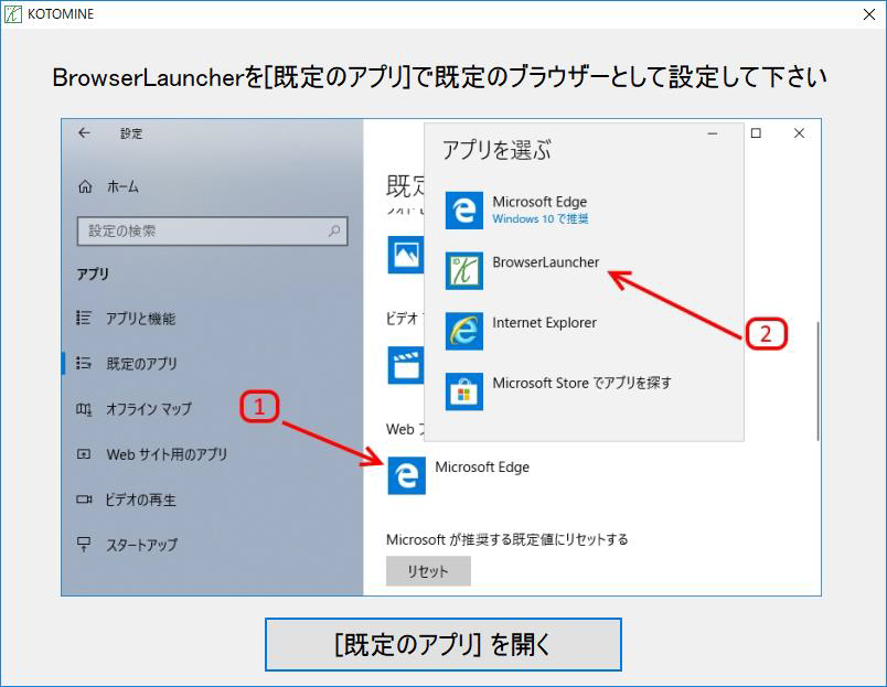 3. Windows 10 の場合、下記の画面が表示されます。「[既定のアプリ]を開く」ボタンをクリックし、設定アプリの[既定のアプリ]でBrowserLauncher を既定のブラウザーとして設定します。