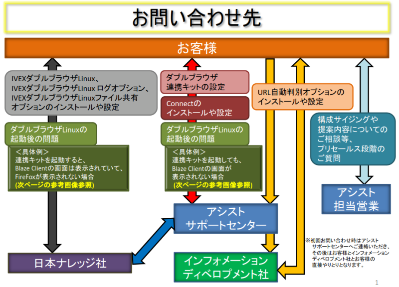 ダブルブラウザソリューションは複数社の製品を組み合わせてご利用いただております関係上、それぞれの製品についての お問い合わせ先が異なっております。それぞれのサポートセンター間で情報の連携は可能ですが、迅速なサポートの為にも 適切なお問い合わせ先へのご連絡をお願いいたします。