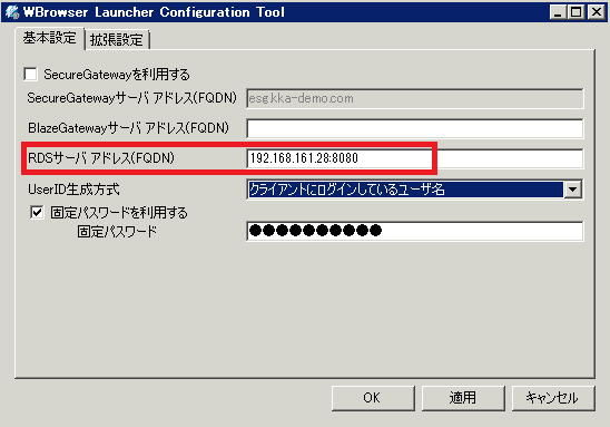 ※Ericom Connect SecureGatway サーバを利用せず、直接Linux サーバへ接続する場合、サーバアドレスの最後にポート:8080 を指定します。
