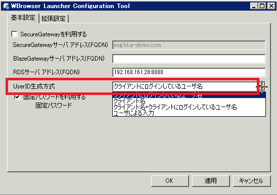 プルダウンから、Connectサーバへ接続する際のログインユーザ方式を指定します。